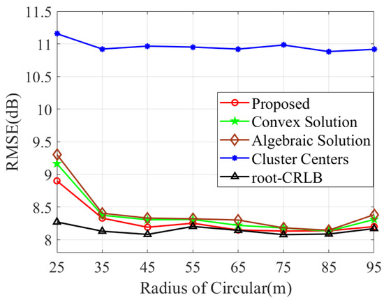In this subsection, we analyze the complexity of the proposed method. For Algorithm 1, we first need to calculate all EPs by the closed form solution (8) and their corresponding NDSs by (13). Note that these can be performed in parallel and that the computational complexity of this step is proportional to . After that, we need to calculate the distance between each pair of EPs, with the computational complexity being proportional to . Subsequently, we sequentially perform K searches to obtain K cluster centers, with the complexity of each search and the computational complexity of this step being proportional to . For Algorithm 2, the computation complexity per iteration is dominated by (39) and (40). Note that although matrix inversion is involved in (40), is a small (only 2 × 2) matrix, so the mean and variance of each message can be obtained through linear complexity addition and multiplication operations efficiently. Moreover, the computation complexity per iteration for each target is proportional to . Overall, the computation complexity of the proposed method is proportional to . To the best of our knowledge, this is the first work investigating data-level multi-target association and localization with range and angle measurements in distributed radars. Thus, we cannot make a comparison with existing methods. From the perspective of existing state-of-the-art single-target localization approaches [17,18], their complexity is proportional to due to matrix inversion operations, being significantly higher than our message-passing-based single-target localization method .