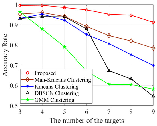 The comparison of measurement association accuracy across different target spacings is presented in Figure 6. It is apparent that the proposed method significantly surpasses other clustering methods, achieving nearly 100% accuracy when the radius R exceeds 55 m. In Table 3, we present and across different R values. It is shown that gradually declines as target spacing increases. Additionally, the proposed clustering algorithm demonstrates a remarkable ability to correctly identify the number of targets K, with an accuracy of 99.4% when R = 25 m.
