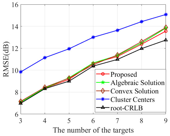 Furthermore, we apply the proposed method to accomplish measurement association and compare the RMSE performance with [17,18]. As illustrated in Figure 7, the proposed method outperforms [17,18], and it also exhibits a superior consistency with CRLB over a broad range of target spacings.