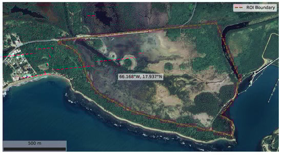 Two-hundred-acre reforestation study plot within the Jobos Bay Mangrove Forest, Puerto Rico. The red dashed line outlines the region of interest (ROI). Data were collected in November 2023.