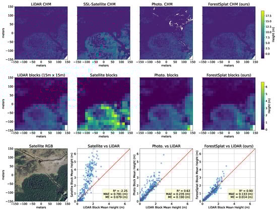 Visual comparison of CHMs generated by different methods for partition #19, compared against LiDAR. Top row: The CHMs at high resolution of GSD at 0.1 m are shown for Airborne LiDAR, SSL-Satellite [17], photogrammetry-based Pix4D [34], and ForestSplat (proposed pipeline). Second row: CHMs downsampled to 15 m × 15 m blocks to facilitate direct comparison with LiDAR-based block averages. Last row: Satellite RGB image of the study area, providing context for the canopy structure and scatter plots evaluating the block-wise correlation of each method with the LiDAR ground truth.