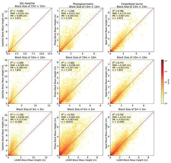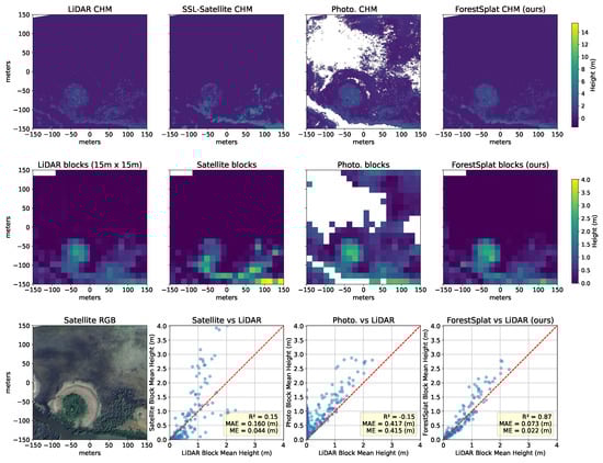 To evaluate the performance of each method under different spatial resolutions, we analyzed the results of canopy height models (CHMs) using varying block sizes: , , and . The scatter plots in Figure 7 illustrate the correlation between the predicted block mean heights and the LiDAR ground truth for SSL-Satellite, photogrammetry-based, and the proposed ForestSplat method at these resolutions.