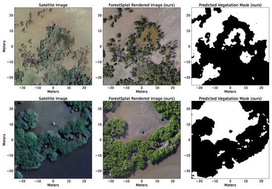 In Figure 8, we present two examples of rendered image tiles, each covering an area of 50 m × 50 m, compared to satellite images. These examples demonstrate that the proposed method can achieve the ultra-high resolution required for MRV. The rendered images have a ground sampling distance (GSD) of 1 cm per pixel, with each tile containing pixels. The last column displays predicted vegetation masks generated from the corresponding rendered images.