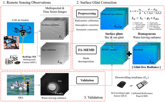 This study is structured to address the acquisition of high spatial resolution UAV data and the correction of sun and sky glints as follows: We illustrate the procedures of our solution in Section 2 and discuss our observations in Section 3. Next, in Section 4.1 we test whether it is possible to extract the physical signal of surface glints from the decomposed modes. To verify this, in Section 4.2, we apply the FA-MEMD technique to consecutive imagery drawn from various regions with different seawater conditions. Specifically, we conducted a comparative analysis using water-leaving radiance (Lw-SBA) measured using the Skylight-Blocked Approach (SBA) to verify the accuracy of the radiance images with surface glints removed. In Section 4.3, we demonstrate how the new approach performs better than currently available methods. In Section 5 and Section 6, we discuss our results and present the summary, respectively. Notably, this approach proposes a new method for identifying and removing periodic surface glint features using only images captured continuously from a fixed location, without requiring consideration of variables such as surface wind direction, speed, roughness, or wave characteristics.