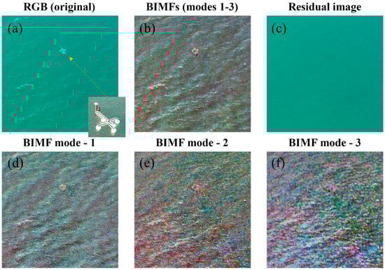 FA-MEMD enables scale-based decomposition of large datasets by employing order statistic filtering instead of spline interpolation during the sifting process. This approach significantly reduces the computational burden associated with expanding the data domain, facilitating fast and adaptive multidimensional signal processing. FA-MEMD also aligns scales across Bidimensional Intrinsic Mode Functions (BIMFs) within the data’s dimensional domain. This capability is especially beneficial for high-resolution time-series data such as UAV sea surface images. FA-MEMD decomposed the sea surface monitoring images into a finite number of BIMFs (Figure 3b) and residual images (Figure 3c) based on variations in the scale and frequency over time. BIMFs were decomposed mode-wise from large to small signals according to the frequency of the detected signal (Figure 3d–f).
