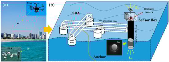 (a) SBA and UAV systems operating simultaneously. (b) Schematic of the SBA system. The SBA system floats on the sea surface using buoys and can be secured in position with anchors. It is capable of measuring water-leaving radiance (Lw) and downwelling irradiance (Ed) from a fixed location above the water surface.