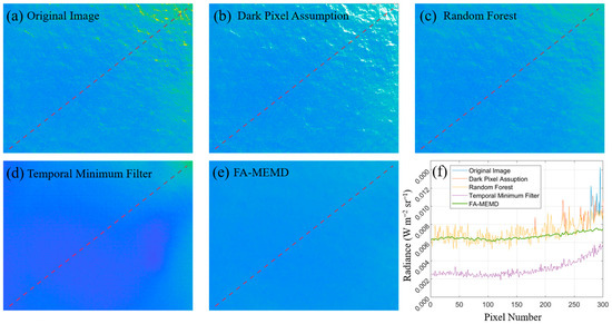 Spatial comparison results with previously reported methods for removing surface glints. (a) Original image. (b) Dark Pixel Assumption (NIR > 0). (c) Random Forest. (d) Temporal Minimum Filter. (e) FA-MEMD. (f) Cross-sectional data graphs extracted from images corrected using each method.