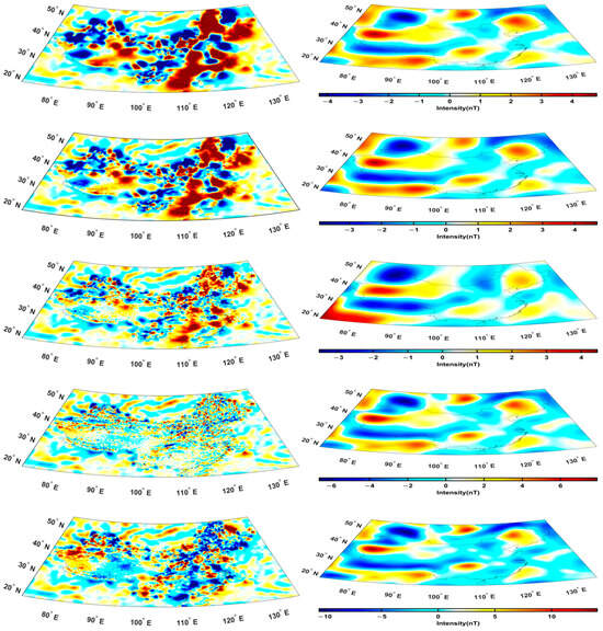 The distributions at different altitudes. Left column: from bottom to up, the distributions are 0, 0.2, 0.4, 0.6, …, 1.6 km. Right column: from bottom to up, the distributions are 5, 100, 200, 280.89 (average of CHAMP data), 300, 400, 457.08 (average of MSS-1 data), 476.77 (average of Swarm data), and 500 km. The structures at different altitudes show the fast and relatively steady structures of the magnetic field. Units: nT.
