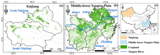 The study area. (a) Xinjiang Spatial distribution of croplands in 2018. (b) Middle-lower Yangtze Plain Spatial distribution of croplands in 2018. (c) Location of study area in China.