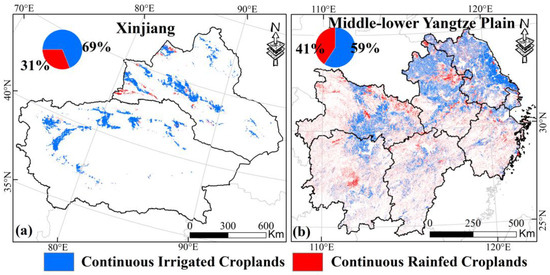 Spatial distribution of continuous irrigated croplands and rainfed croplands in Xinjiang (a) and MYP (b). The pie charts in the upper left corner show the area percentage.