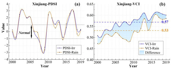 PDSI (a) and VCI (b) in Xinjiang from 2000 to 2019. (a) PDSI value of −1–1 represents normal meteorological dry and wet conditions. (b) the blue and orange lines represent irrigated croplands and rainfed croplands, respectively. The dotted lines represent the 20-year average VCI. The blue shadows represent the difference in AD between irrigated croplands and rainfed croplands. Only data from April to October for Xinjiang were selected.