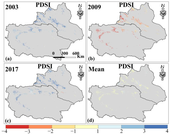 (a–c) are the spatial distribution of PDSI in Xinjiang in 2003, 2009, and 2017. (d) is the average PDSI from 2000 to 2019. Only data from April to October for Xinjiang were selected.