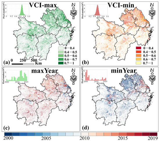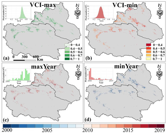 The maximum (a) and minimum (b) values of VCI in MYP from 2000 to 2019 and the corresponding years (c,d) (note: The sub-figure in the upper left corner of the picture is a histogram plot). Only data from March to November for MYP were selected.