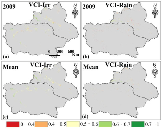 (a,b) are the VCI spatial distribution of irrigated croplands and rainfed croplands in Xinjiang in 2009. (c,d) are the average VCI from 2000 to 2019. Only data from April to October for Xinjiang were selected.