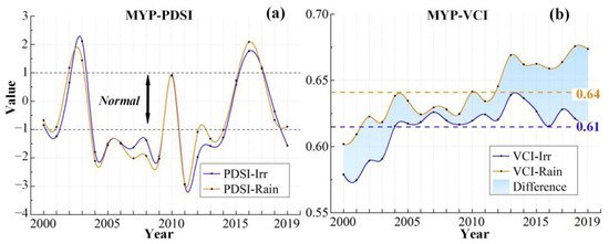 PDSI (a) and VCI (b) in MYP from 2000 to 2019. (a) PDSI value of −1–1 represents normal meteorological dry and wet conditions. (b) the blue and orange lines represent irrigated croplands and rainfed croplands, respectively. The dotted lines represent the 20-year average VCI. The blue shadows represent the difference in AD between irrigated croplands and rainfed croplands. Only data from March to November for MYP were selected.