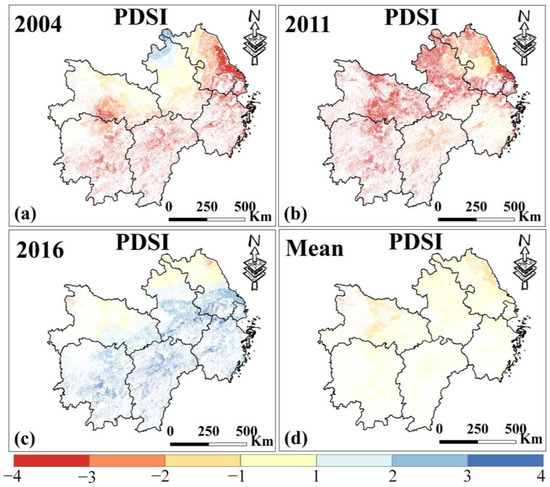 (a–c) are the spatial distribution of PDSI in MYP in 2004, 2011, and 2016. (d) is the average PDSI from 2000 to 2019. Only data from March to November for MYP were selected.