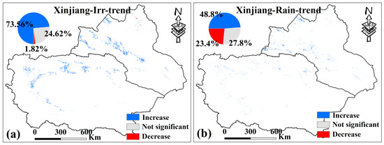 (a,b) are the MK test results of the VCI of irrigated croplands and rainfed croplands in Xinjiang from 2000 to 2019, respectively, p < 0.05. Only data from April to October for Xinjiang were selected.