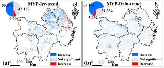 For MYP (Figure 12), 50.3% of irrigated croplands and 63.1% of rainfed croplands show a significant increase in VCI, indicating alleviation of drought (p < 0.05). Unlike Xinjiang, the areas with significant VCI decreases in MYP are small (6.6% for irrigated croplands and 5.6% for rainfed croplands), with the remaining areas showing no significant trend (43.1% and 31.3%, respectively). The proportion of alleviated drought is higher in rainfed croplands than in irrigated croplands, and the area with worsening drought is very small. This suggests that while irrigation in MYP has a clear anti-drought effect, it is not as effective as in Xinjiang.