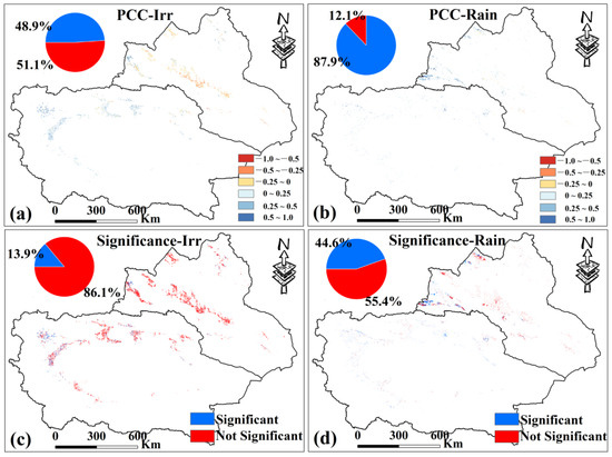 (a,b) are the spatial distribution of PCC between PDSI and VCI of irrigated croplands and rainfed croplands in Xinjiang from 2000 to 2019. (c,d) are the spatial distribution of PCC significance test results. Only data from April to October for Xinjiang were selected.