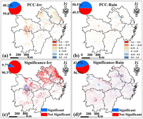 (a,b) are the spatial distribution of PCC between PDSI and VCI of irrigated croplands and rainfed croplands in MYP from 2000 to 2019. (c,d) are the spatial distribution of PCC significance test results. Only data from March to November for MYP were selected.