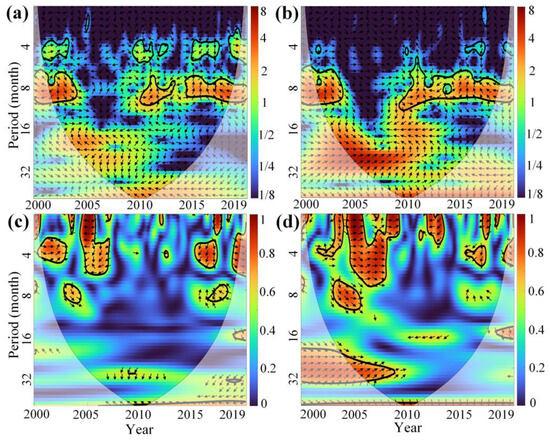 Cross-wavelet transform (XWT) and wavelet coherence (WTC) analysis are powerful techniques that combine wavelet transformation with statistical analysis [90]. They are widely used in signal processing and time series data analysis to study the time–frequency characteristics of signals and to explore the correlations and resonant patterns between time series data.