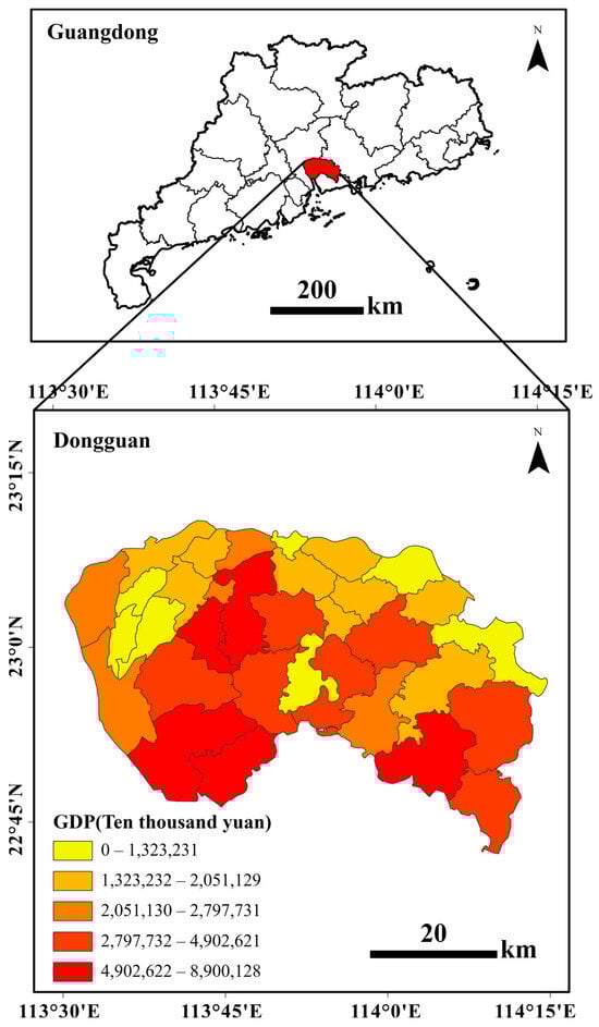 Dongguan, located in the central–southern part of Guangdong Province, is a leading proponent of China’s reform and opening-up policies. Primarily driven by the manufacturing industry, the city has gained international recognition as the “world’s factory”. In recent years, Dongguan’s economy has grown rapidly, with its GDP consistently ranking among the highest in Guangdong Province. It is a vital city in the Pearl River Delta region, known for its vibrant economy (Figure 1). We selected Dongguan for two main reasons: First, its economic development model is representative of Guangdong Province and even China as a whole. Second, the city’s diverse geography and socioeconomic conditions provide valuable data for estimating GDP using nighttime light, street-view imagery, and POI data. A comprehensive understanding of the economic conditions in each town of Dongguan is imperative for the government to formulate informed decisions regarding land-use planning and urban development policies.