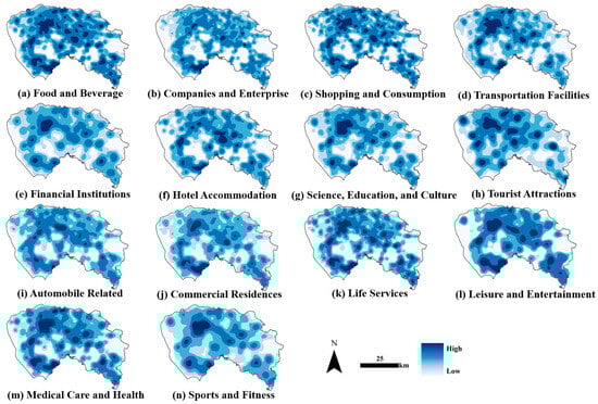 The POI data used in this study were sourced from Gaode Maps in March 2022. First, we removed incomplete and inconsistent data, including POI entries outside Dongguan’s administrative borders and duplicate records. Next, we utilized the “Kernel Density” tool in ArcGIS Pro 3.1 to calculate the density of POIs across 14 major categories (e.g., food and beverage). For this analysis, we set a search radius of 500 m and a cell size of 1000 m. Then, we calculated the average kernel density for each category at the town scale using zonal statistics. The results are shown in Figure 3, which highlights differences in economic activity across areas.