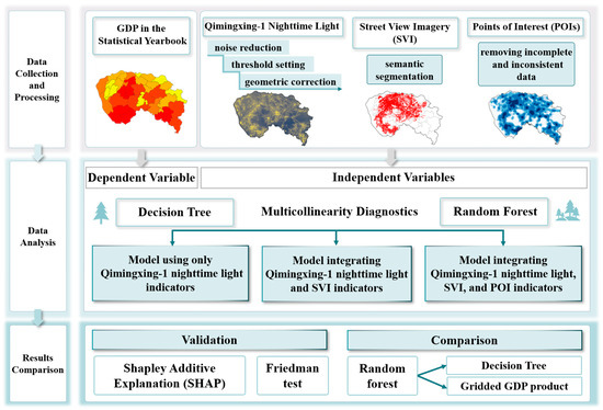 In this study, we first obtained the GDP data for Dongguan at the town scale in 2022, along with the Qimingxing-1 nighttime light, street-view, and POI data. Then, the Qimingxing-1 nighttime light data were processed through noise reduction, threshold setting, and geometric correction to derive the nighttime light indicators. For the SVI, we used semantic segmentation to extract the SVI indicators. The POI data were cleaned by removing incomplete and inconsistent entries, allowing us to extract the POI indicators. Subsequently, we constructed both random forest and decision tree models using GDP as the dependent variable and the Qimingxing-1 nighttime light, POI, and SVI indicators as the independent variables. The results of three different random forest models were then compared and analyzed to validate the effectiveness of the model integrating the Qimingxing-1 nighttime light, SVI, and POI indicators. Finally, the model was further evaluated using the Friedman test and SHAP values, and the best-performing random forest model was compared with the 1 km gridded GDP dataset, thereby enhancing its reliability (Figure 4).