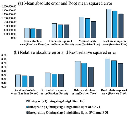 As shown in Table 3, the random forest model outperformed the decision tree model across all evaluation metrics. Notably, after integrating the SVI and POI indicators, the performance of the random forest model improved further. It achieved a correlation coefficient of 0.9796, compared to 0.8018 for the decision tree model. In addition, each error metric demonstrated that the random forest model exhibited higher accuracy and stability in predicting regional economic activities (Figure 6). These results highlight the distinct advantages of the random forest model in handling complex datasets, particularly in capturing nonlinear relationships, resisting noise interference, and enhancing generalization capabilities. By comparing the outcomes of the decision tree and random forest models, the superiority of the latter in GDP prediction was evident.