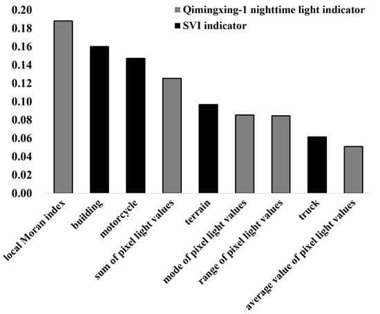 The importance of each indicator after normalization in the random forest model integrating Qimingxing-1 nighttime light and SVI indicators.