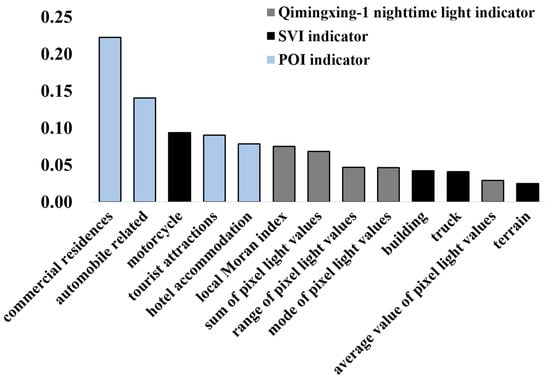 The importance of each indicator after normalization in the random forest model integrating Qimingxing-1 nighttime light, SVI, and POI indicators.