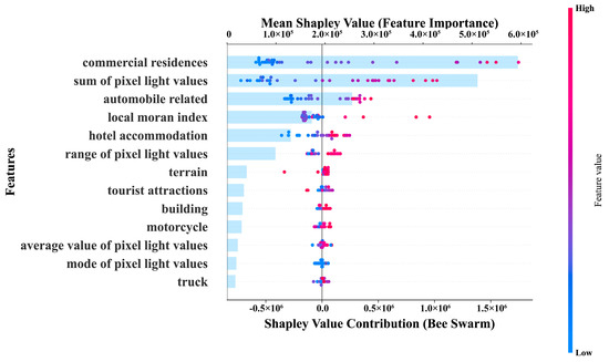 In Figure 11, SHAP (Shapley Additive Explanation) values are used to demonstrate how 13 features affect town-level GDP in Dongguan. Each data point represents the contribution of a single feature to an individual sample [67,68]. All features exhibit positive SHAP values, indicating their positive role in driving economic growth. The two most influential factors are “commercial residences” (SHAP = 593,590.2) and “sum of pixel light values” (SHAP = 511,260.7), which reflect Dongguan’s economic characteristics. In addition, “automobile related” (SHAP = 255,544.1) highlights the importance of transportation infrastructure and industrial zones, consistent with Dongguan’s identity as a manufacturing hub. The street-view imagery reflects human activities and preferences at various times and locations. The POI data show the distribution of buildings such as commercial residences. The Qimingxing-1 nighttime light data identify spatial hotspots of various activities. Therefore, the SHAP values further explain the behavior of the random forest model.
