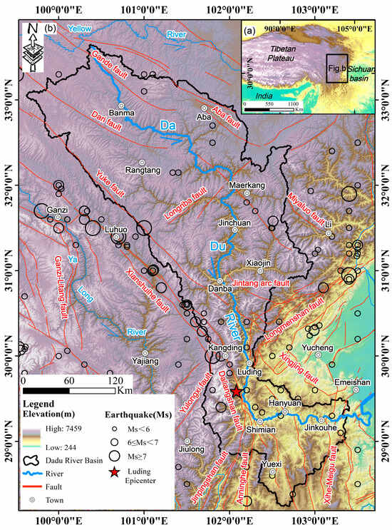 (a) Location of Daduhe river basin; (b) Tectonic setting of Daduhe river basin.