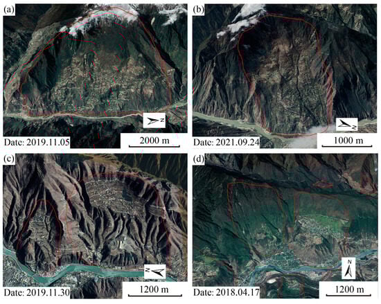 The landscape features of the large landslides are clearly visible in the remote sensing image maps (Figure 2a–d). These landslides are large in scale, exhibiting various shapes, such as tongues and semicircles, with well-defined boundaries and prominent trailing edges. Additionally, the loss of rock and soil mass from the landslides has caused noticeable sagging of the terrain compared to the surrounding landscape. Deposition frequently occurs at the slope foot near the riverbank, altering the natural flow of the river and causing the river to curve toward the opposite bank. The landslide areas are characterized by sparse vegetation, exposed soil and rock, and clear signs of collapse, making them easily identifiable in the images.