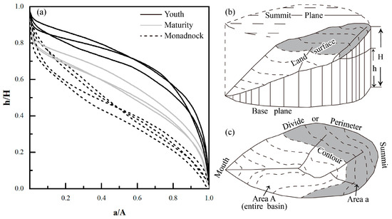 (a) Hypsometric curve; (b,c) Hypsometric integral calculation principle (adapted from Strahler, 1952) [20].