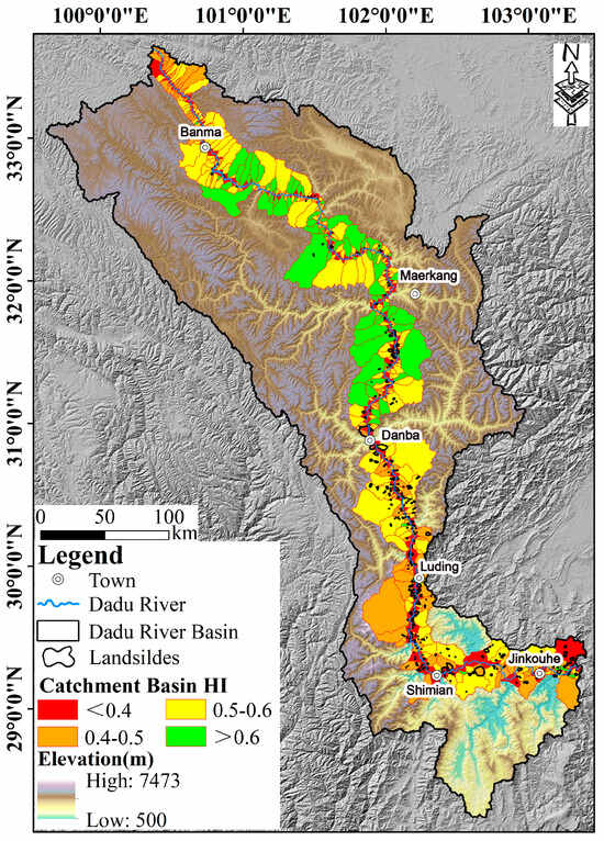 Distribution of landslides and HI values of catchments in Daduhe river basin.