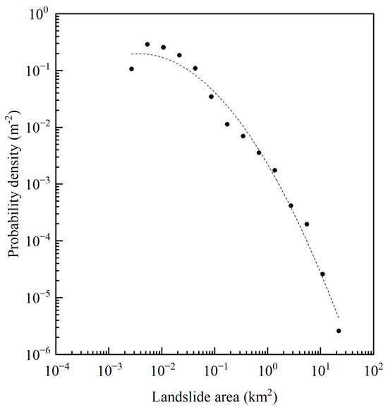 The probability density analysis yielded a curve that predominantly follows a monotonically decreasing pattern (Figure 7), which is commonly associated with the power-law recurrence relationships observed in landslide distributions [46]. Although the results show a K-S test statistic of D = 0.0794 and p = 0.0056, indicating that the landslide area data deviate from a lognormal distribution at the 95% confidence level, previous studies have demonstrated that landslide area distributions can vary due to regional differences, geological settings, data completeness, and classification criteria [47,48].