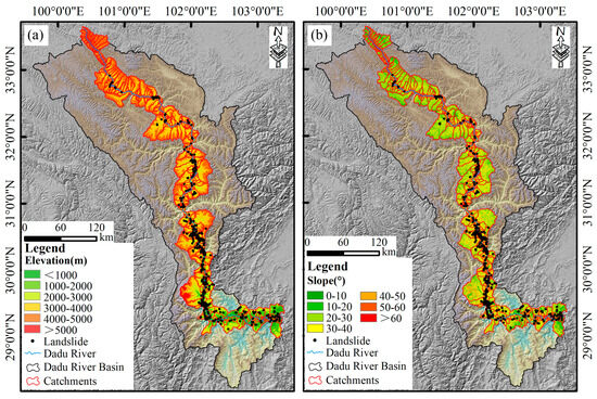Elevation and slope distribution in catchments of Daduhe river’s mainstem. (a) Elevation; (b) Slope.