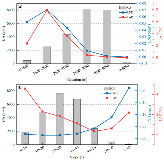 The relationship between landform factor, LND, and LAP of large landslides. (a) Elevation; (b) Slope. (CA is the area of the study area corresponding to each classification; LND is landslide number density; LAP is landslide area percentage).
