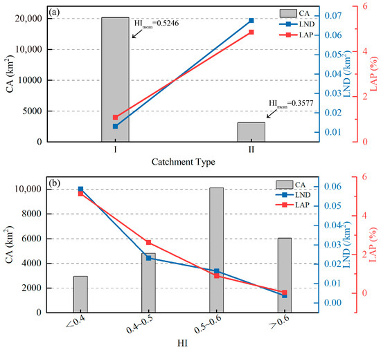 An analysis of the large landslide distribution in the two types of catchments (Figure 10a) reveals distinct differences between them. Specifically, both LND values and LAP values are higher in Type II catchments compared to Type I catchments. Additionally, the average HI value is greater for Type I catchments than for Type II catchments. These findings indicate that large landslides are more likely to occur in Type II catchments. This increased susceptibility may be attributed to the presence of the Daduhe river’s mainstem, which runs through these catchments, enhancing surface erosion. The slopes on both sides of the river are particularly affected by the dynamic flow of water, which contributes to slope instability and results in the occurrence of numerous landslides.