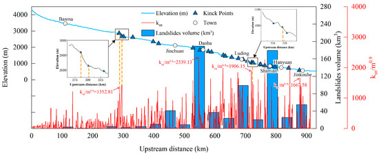 Correlation analysis between longitudinal profile of Daduhe river’s mainstem and landslide volume of catchment, ksn, and knickpoints.