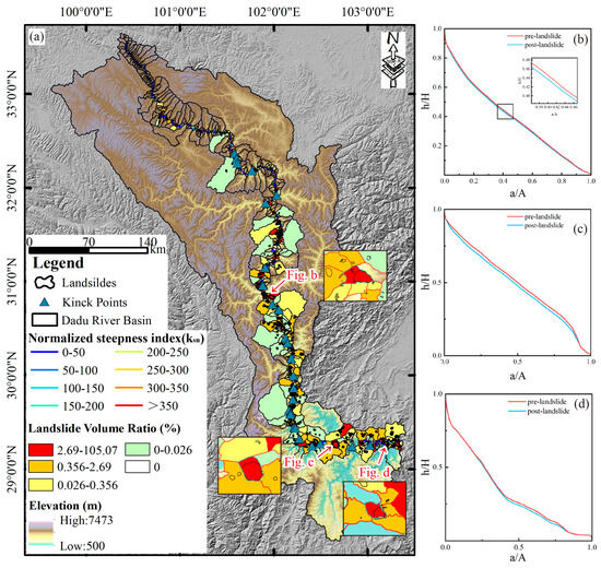 (a) Influence of landslide development on the amount of denudation in catchments. (b–d) Changes in HI curves in catchments before and after landslides.