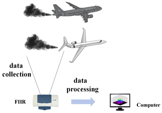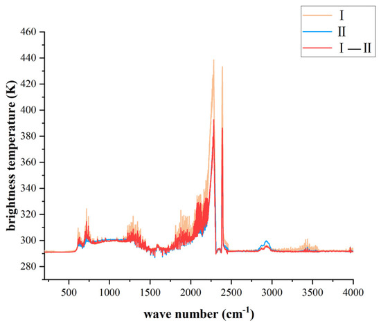 The spectrometer was kept at a distance of 5 m and 10 m from the aero-engine, perpendicular to the nozzle outlet of the exhaust stream. During the measurement, the outdoor temperature was 26.3 °C, and the humidity was 56.4%Rh. The measuring instrument was an EM27 Fourier infrared spectrometer, the measurement mode was passive measurement mode, the spectral resolution was 1 cm−1, the spectral measurement range was 2.5–12 μm, and the full perspective reached 30 mrad. The EM27 spectrometer initially subtracts the bias of the spectral signal entering the instrument and obtains the luminance temperature according to Planck’s formula [33].