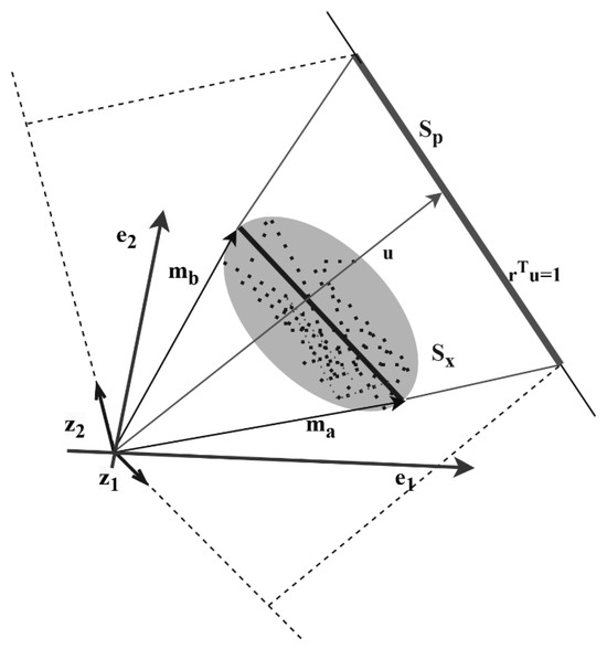 The vertex component analysis is based on the concept of simple forms. In our mixed spectral data, each spectrum can be seen as a point in a high-dimensional space, with the pure spectrum at the apex of this space. After the affine transformation of the projection, the spectrum representing the pure matter remains at the apex. Therefore, by projecting the data into an orthogonal subspace direction, we calculate the vector with the largest projected distance value, which is the end element to look for. As shown in Figure 3, the small black dots represent all the mixed spectral data vectors. The singlet is the projection on the hyperplane found by the vector, and the vertices of are still the vertices of the singlet after projection. Estimates of the endmembers and can be found according to and in the projection vector.