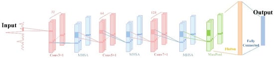 With the deepening of the network architecture, the number of channels and redundant information in the training process increases. Inspired by human sensory vision, the attention mechanism is used to optimize features so as to improve the efficiency of network training. In this paper, a one-dimensional deep learning (MHSA-CNN) algorithm is proposed for feature extraction and visualization analysis of the pure spectrum of the hot jet of two aero-engines after unmixing. The structure diagram of the one-dimensional convolutional neural network model MHSA-CNN constructed by us is shown in Figure 4. The model consists of three convolution layers of different scales, a multi-head self-attention mechanism module, a maximum pooling layer, a flat operation, and full connection layer to extract the features of the two pure spectra extracted by VCA. In order for the network to extract multi-scale and local characteristic information of two different aero-engine hot jets, convolution kernels of different sizes are used for the three convolution layers. The specific parameters of the convolution layers are shown in Table 1. Deep learning networks generate more parameters during operation. In order to retain key features and reduce redundancy, the convolution kernel size of the maximum pooling layer is set to 2, and the feature length is halved so that the convolution and pooling operations compress the feature length.