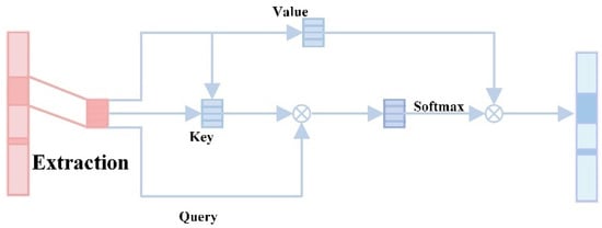 We believe that the largest wave peak in the spectral information is the characteristic peak, and the local wave peak extracted by the convolutional neural network (CNN) is input into the attention mechanism, which is divided into three parts: query (Q), key (K), and value (V). The query represents the characteristic peak of the current network attention, the key represents all the peaks of the input spectral data, and the value represents the actual characteristic peak. Firstly, the similarity of the query and key is calculated by the dot product operation; that is, the correlation between the two is judged. The higher the similarity, the more relevant the feature peaks of current concern are. Next, the similarity is converted to probability weights by the softmax function, and these weights are then weighted to sum all characteristic peaks. The process of extracting feature peaks of the attention mechanism is shown in Figure 5.