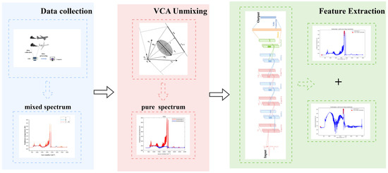 The main working flow chart of this paper is shown in Figure 7. First, the spectral data of the hot jet of the two aero-engines is collected, and the mixed spectral is unmixed. After the unmixing, the pure spectral data are analyzed and extracted.