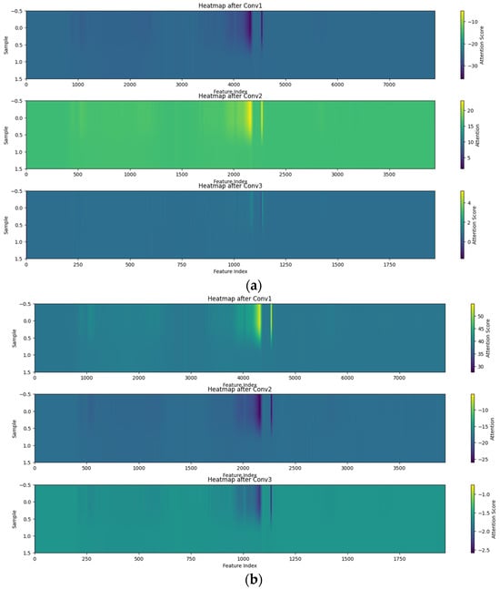 During the operation of the network, in order to better understand the feature extraction effect of different convolution layers on the hot jet spectral data of two aero-engines, we multiply the feature set of the deep layer of the network with the weight coefficient matrix obtained by the pooling layer and finally map a heat map that can represent the attention. The brighter areas in the figure represent areas of high-density or high-intensity data, that is, hot spots. Darker areas represent areas of low-density or intensity data, as shown in Figure 9.