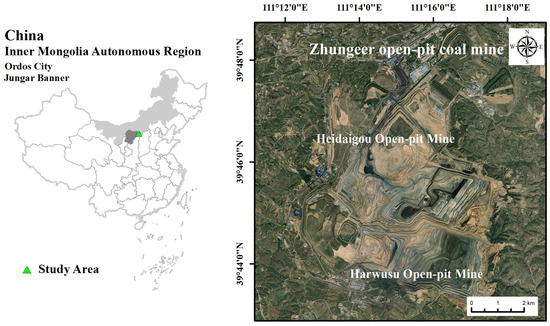 The study area is located within the jurisdiction of the Zhungeer Energy Group’s Heidaigou Open-Pit Coal Mine and the Harwusu Open-Pit Coal Mine in the Zhungeer Banner, Inner Mongolia (110°49′10″E to 111°25′55″E, 39°25′7″N to 40°2′21″N), as illustrated in Figure 1. This region lies between the hilly gully area of the Loess Plateau and the eastern edge of the Kubuqi Desert, belonging to the midstream basin of the Yellow River. The area suffers from significant land desertification and exhibits a fragile ecological environment, which has been exacerbated by continuous capacity expansion that has also led to ecological degradation. The eastern boundary of the mining area is located a mere 4.3 km from the mainstream of the Yellow River. It experiences a typical temperate continental climate with distinct seasons; the average annual temperature for the entire banner ranges from 6.2 °C to 8.7 °C. The annual average precipitation in Zhungeer Banner is approximately 400 mm, predominantly concentrated from July to September, while the annual sunshine hours total around 3000 [23]. The predominant soil type is cinnamon soil, placing the region within a typical transitional zone between grassland and desert steppe, as well as being a representative area of the agricultural-pastoral interspersed zone in northern China. The principal species in the grassland vegetation community include Stipa capillata (bensho grass), Stipa grandis (Kazakhe grass), Lespedeza daurica (Daurian lespedeza), and Thymus mongolicus (Mongolian thyme) [27].
