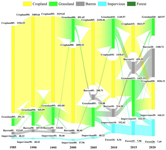 Through a spatial statistical analysis of land use types in the study area over a 35-year period, coupled with a comparative examination of historical remote sensing imagery (as shown in Table 2 and Figure 4), it is observed that the total area of the study region measures 12,736.98 hectares, during which notable changes in land use patterns have occurred. The area of farmland has consistently diminished, plummeting from 3356.55 hectares in 1985 to 1036.31 hectares in 2020, with the primary transition being towards grassland. The area of grassland exhibited a trend of initial expansion followed by a decline, increasing from 291.33 hectares in 1985 to 665.97 hectares in 2020, and peaking around 2015 at 1435.33 hectares.